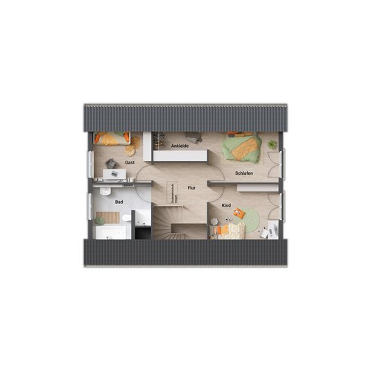 Das großzügige Haus mit dem schönen Satteldach überzeugt mit viel Platz und einem variablen Grundriss. Das Wohnzimmer schenkt genügend Raum zur Erholung, die sich anfügende Essecke wird schnell zum gemütlichen Familienmittelpunkt mit direktem Zugang zur Küche. Die hohen Fenster fangen das Tageslicht besonders gut ein. Jeder Raum im Haus wirkt offen und freundlich. Ein Arbeits- oder Kinderzimmer und das Gäste-WC runden das Erdgeschoss perfekt ab.